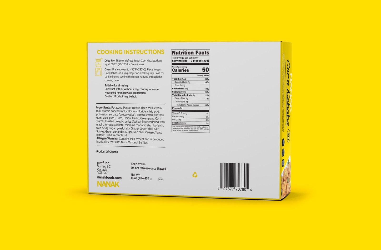 Potatoes, Paneer (pasteurized milk, modified milk ingredients, calcium chloride, citric acid, potassium sorbate [preservative], potato starch, xanthan gum, guar gum), Corn, Onion, Garlic, Green peas, Corn starch, Toasted bread crumbs ([wheat flour enriched with niacin, ferrous sulphate, thiamine mononitrate, riboflavin, folic acid], sugar, yeast, salt), Ginger, Green chili, Salt, Spices, Green coriander, Sugar, Red chili, Vinegar, Yeast extract. Fried in canola oil.