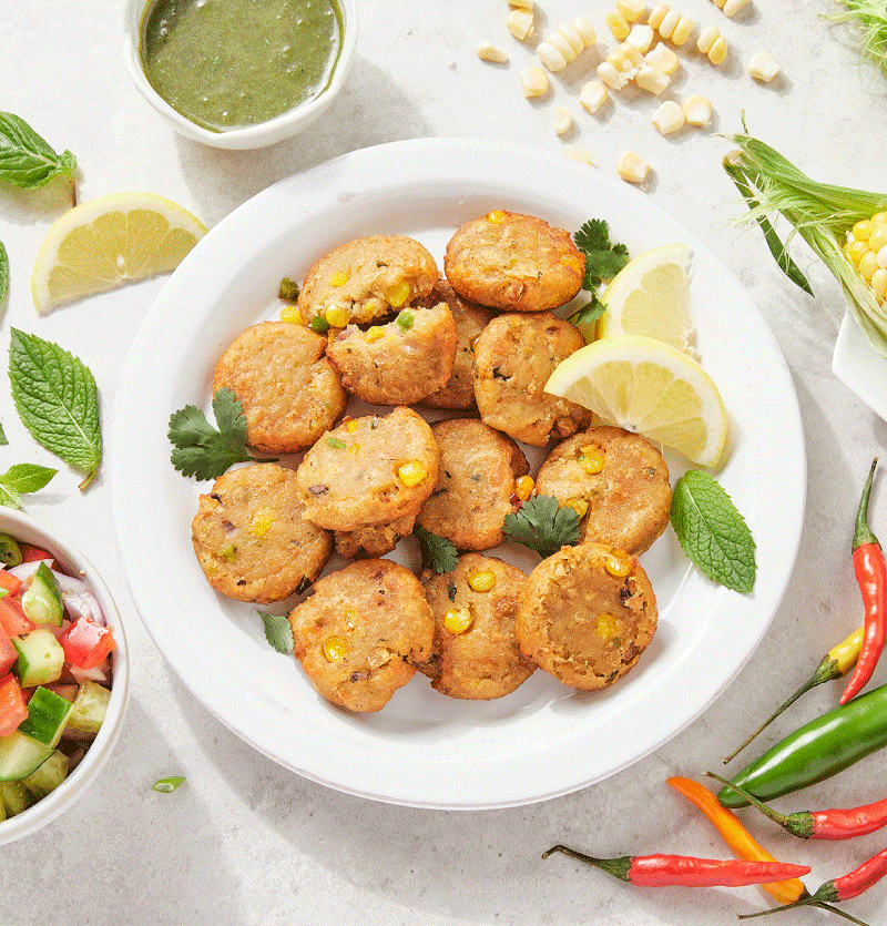 Corn kebabs are rich in garlic and spiced with a delicate blend of masala/spices.