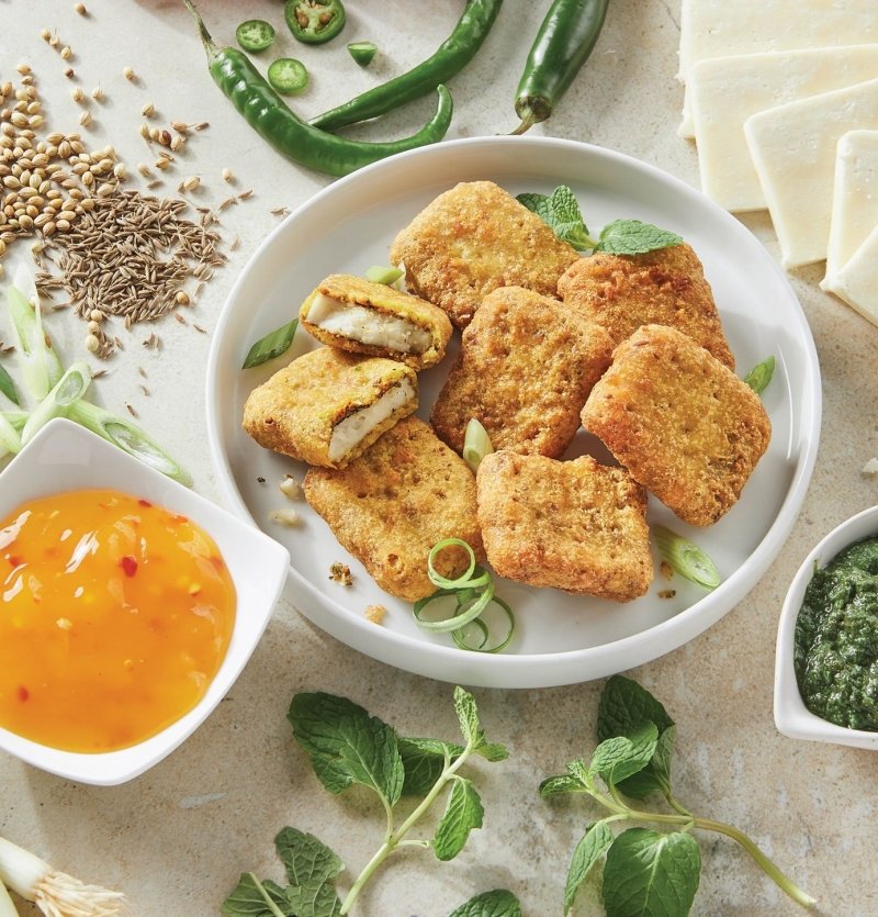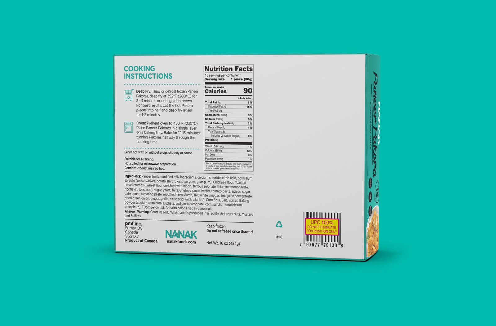 Paneer (milk, modified milk ingredients, calcium chloride, citric acid, potassium sorbate (preservative), potato starch, xanthan gum, guar gum), Chickpea flour, Toasted bread crumbs ([wheat flour enriched with niacin, ferrous sulphate, thiamine mononitrate, riboflavin, folic acid], sugar, yeast, salt), Chutney sauce (water, tomato paste, spices, sugar, date puree, tamarind paste, modified corn starch, salt, white vinegar, lime juice concentrate, dried green onion, ginger, garlic, citric acid, mint, cilantro), Corn flour, Salt, Spices, Baking powder (sodium aluminum sulphate, sodium bicarbonate, corn starch, monocalcium phosphate), FD&C yellow #5, Annatto color. Fried in Canola oil.