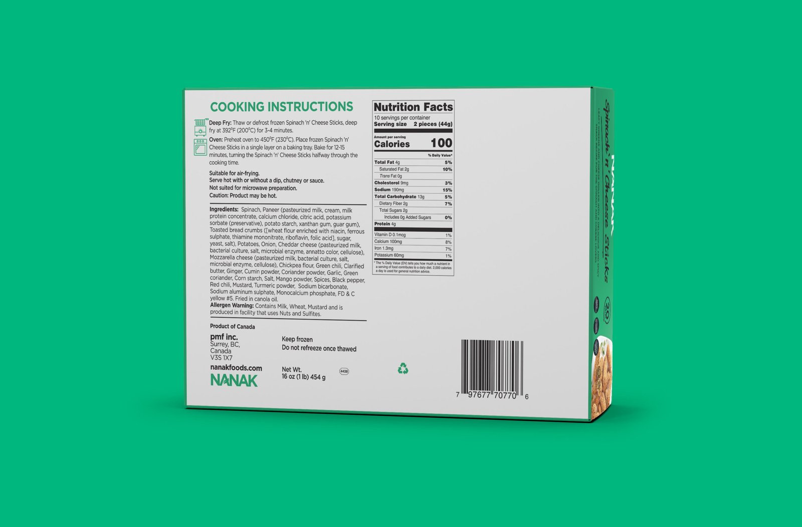 Spinach, Paneer (pasteurized milk, modified milk ingredients, calcium chloride, citric acid, potassium sorbate (preservative), potato starch, xanthan gum, guar gum), Toasted bread crumbs ([wheat flour enrinched with niacin, ferrous sulphate, thiamine mononitrate, riboflavin, folic acid], sugar, yeast, salt), Potatoes, Onion, Cheddar cheese (pasteurized milk, bacterial culture, salt, microbial enzyme, annatto colour, cellulose), Mozzarella cheese (pasteurized milk, bacterial culture, salt, microbial enzyme, cellulose), Chickpea flour, Green chili, Clarified butter, Ginger, Cumin powder, Coriander powder, Garlic, Green coriander, Corn starch, Salt, Mango powder, Spices, Black pepper, Red chili, Mustard, Turmeric powder, Sodium bicarbonate, Sodium aluminum sulphate, Monocalcium phosphate, Tartrazine. Fried in canola oil.