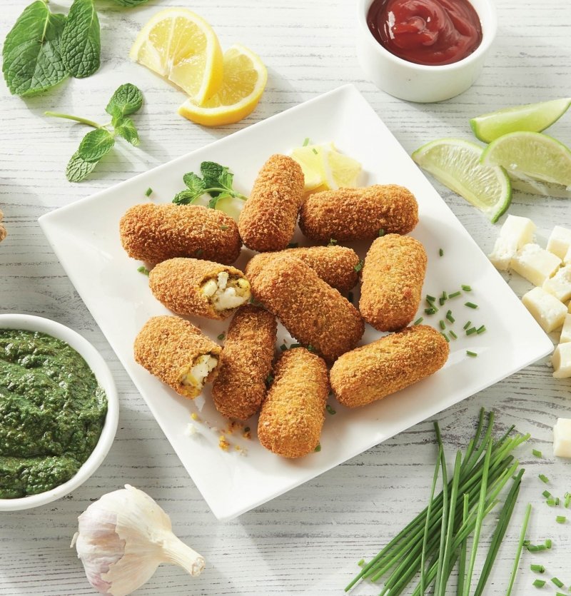 Paneer (pasteurized milk, modified milk ingredients, calcium chloride, citric acid, potassium sorbate [preservative], potato starch, guar gum, xanthan gum), Chickpea flour, Toasted bread crumbs ([wheat flour enriched with niacin, ferrous sulphate, thiamine mononitrate, riboflavin, folic acid], sugar, yeast, salt), Chutney sauce (water, tomato paste, spices, sugar, date puree, tamarind paste, modified corn starch, salt, white vinegar, lime juice concentrate, dried green onion, ginger, garlic, citric acid, mint, cilantro), Corn flour, Salt, Spices, Baking powder (sodium aluminum sulphate, sodium bicarbonate, corn starch, monocalcium phosphate), Tartrazine, Annatto colour. Fried in Canola oil.