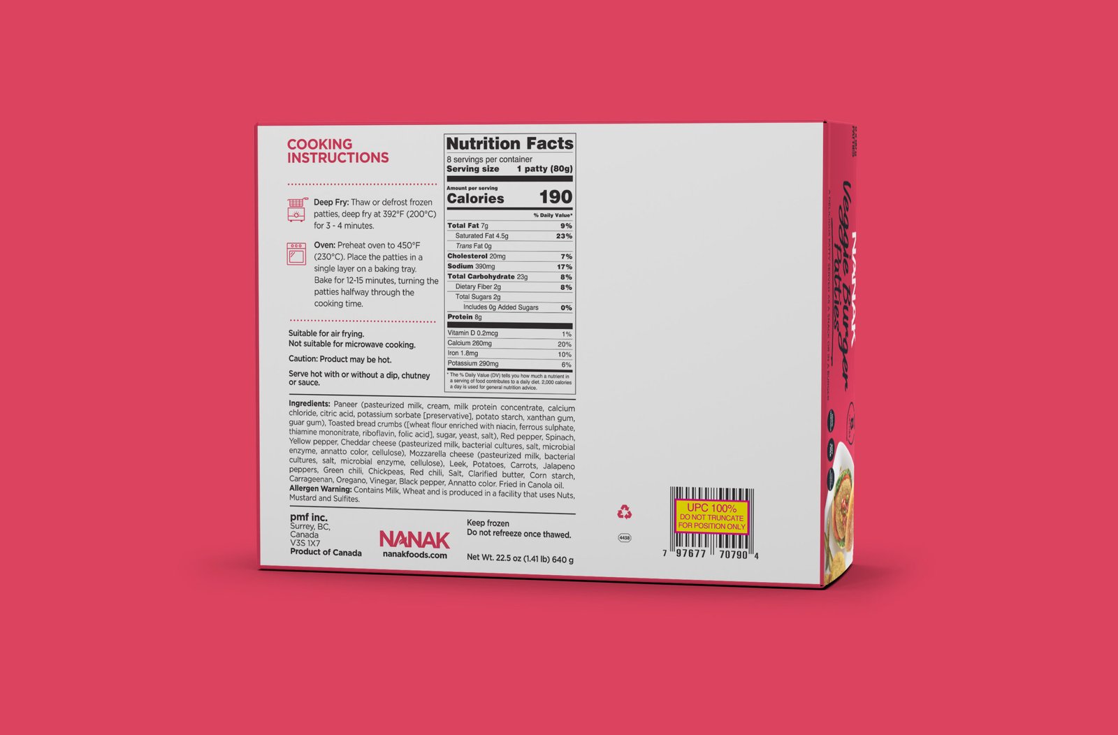 Paneer (milk, modified milk ingredients, calcium chloride, citric acid, potassium sorbate [preservative], potato starch, xanthan gum, guar gum), Toasted bread crumbs ([wheat flour enriched with niacin, ferrous sulphate, thiamine mononitrate, riboflavin, folic acid], sugar, yeast, salt), Red pepper, Spinach, Yellow pepper, Cheddar cheese (pasteurized milk, bacterial culture, salt, microbial enzyme, annatto colour, cellulose), Mozzarella cheese (pasteurized milk, bacterial culture, salt, microbial enzyme, cellulose), Leek, Potatoes, Carrots, Jalapeno peppers, Green chili, Chickpeas, Red chili, Salt, Clarified butter, Corn starch, Carrageenan, Oregano, Vinegar, Black pepper, Annatto colour. Fried in Canola oil.