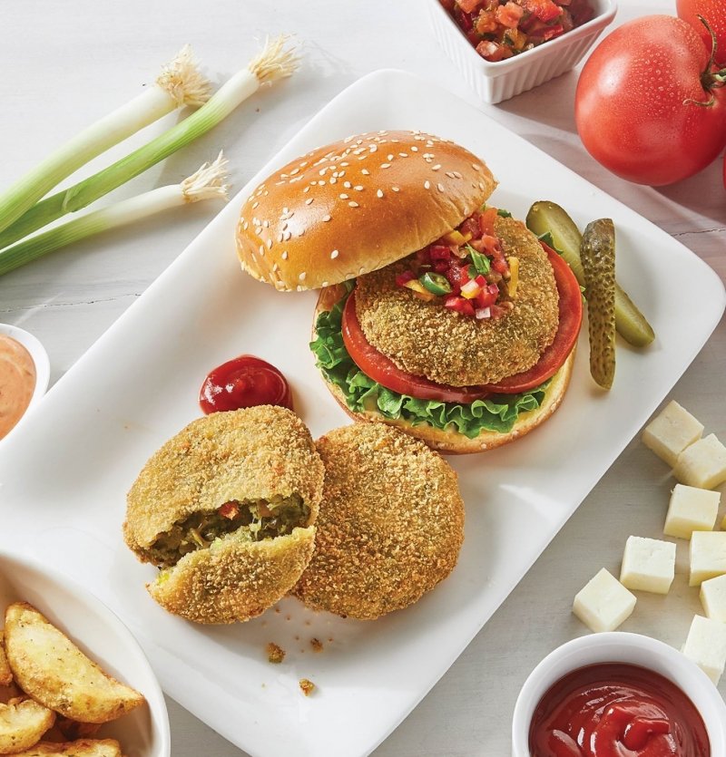 This burger patty/cutlet does not contain any soy ingredients and caters well to vegetarian consumers who are averse to the beany flavor of soybean.
